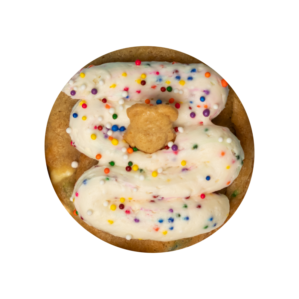 A bite of childhood: Golden Oreos, creamy white chocolate, and Dunkaroo icing with sprinkles. Topped with a teddy bear cookie