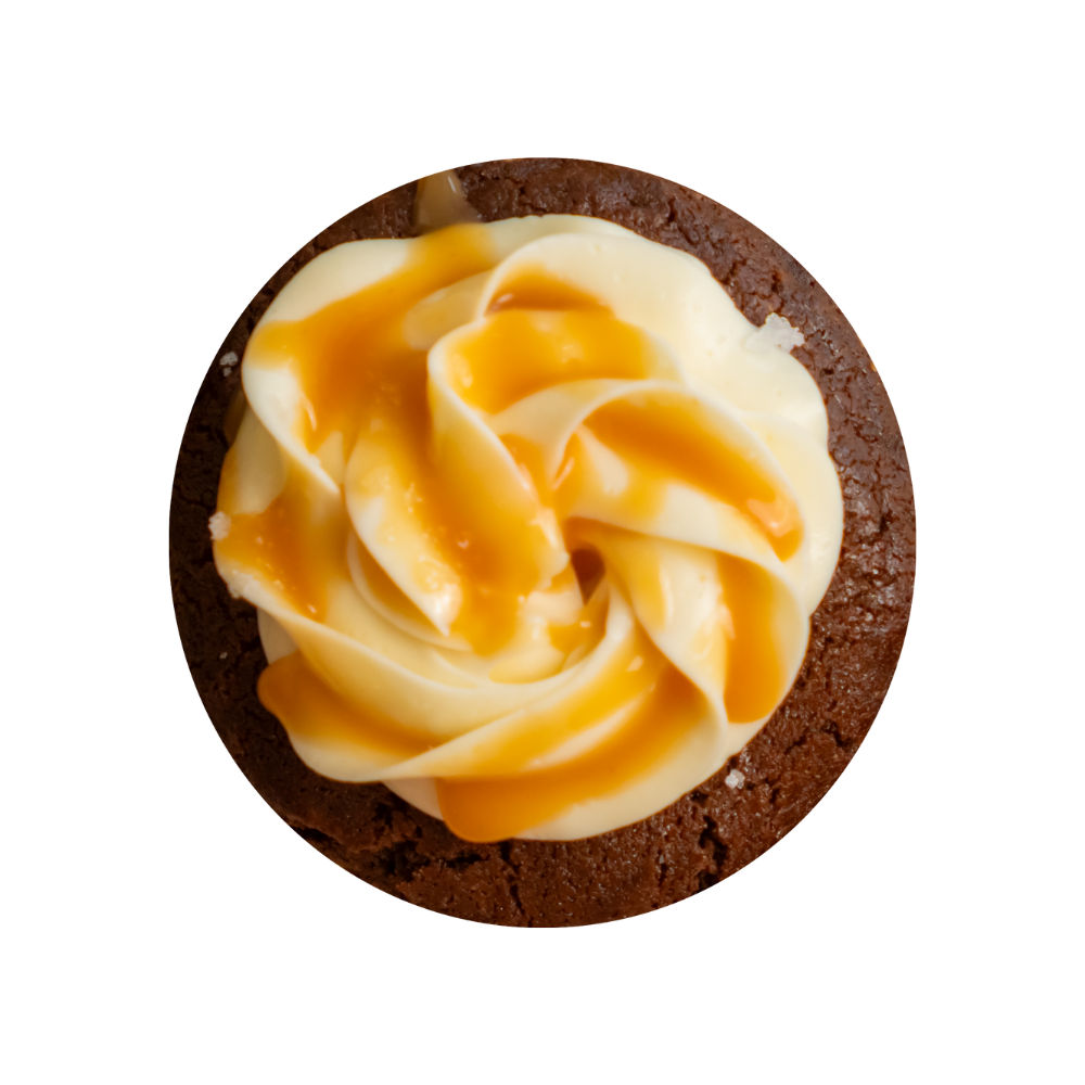 A rich coffee-infused chocolate cookie with milk chocolate, topped with smooth whipped cream, drizzled with golden caramel, and sprinkled with sea salt flakes